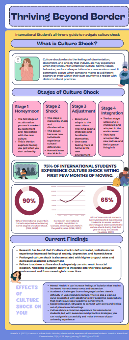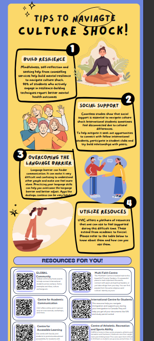 I recently created this infographic for a immigrant psychology class. This infographic introducing us to the topic of their infographic culture shock, and gives us a clear definition, followed by the stages of culture shock, some statistics, and current findings and effects of culture shock. The infographic then goes on to give some tips to navigate culture shock and leaves 6 different resources people can reach out to.